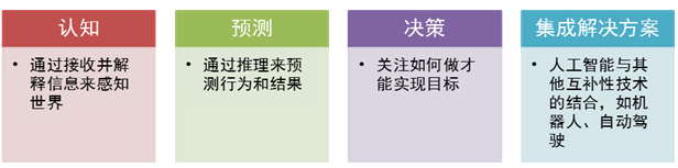麦肯锡发布的《中国人工智能的未来之路》将人工智能技术分为认知、预测、决策和集成解决方案四个方面[i]。