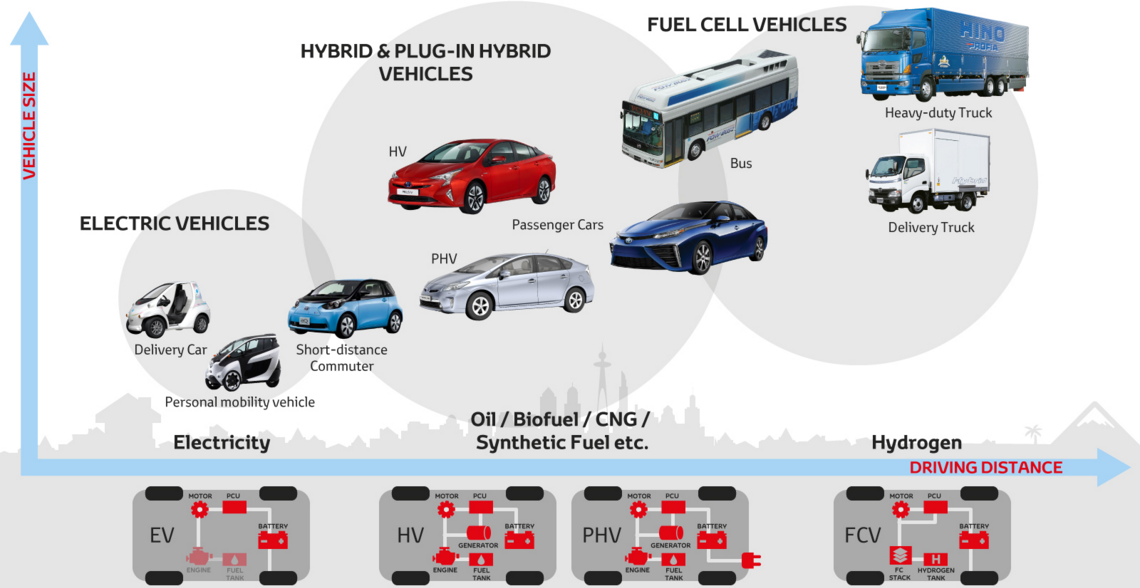 图1为技术路线图在汽车行业的应用。该图指出了汽车从纯电动车、混合动力车到燃料电池汽车的新能源车发展路线。