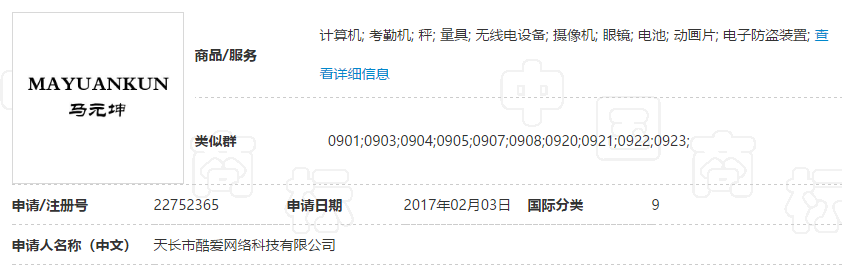天长市酷爱网络科技有限公司在第9、18、25、35、36、41、43类上均注册了“马元坤”的商标,与广州市胶己人服饰有限公司不同的是,天长市酷爱网络科技有限公司在第9、18、35、41类上的申请都获准注册。