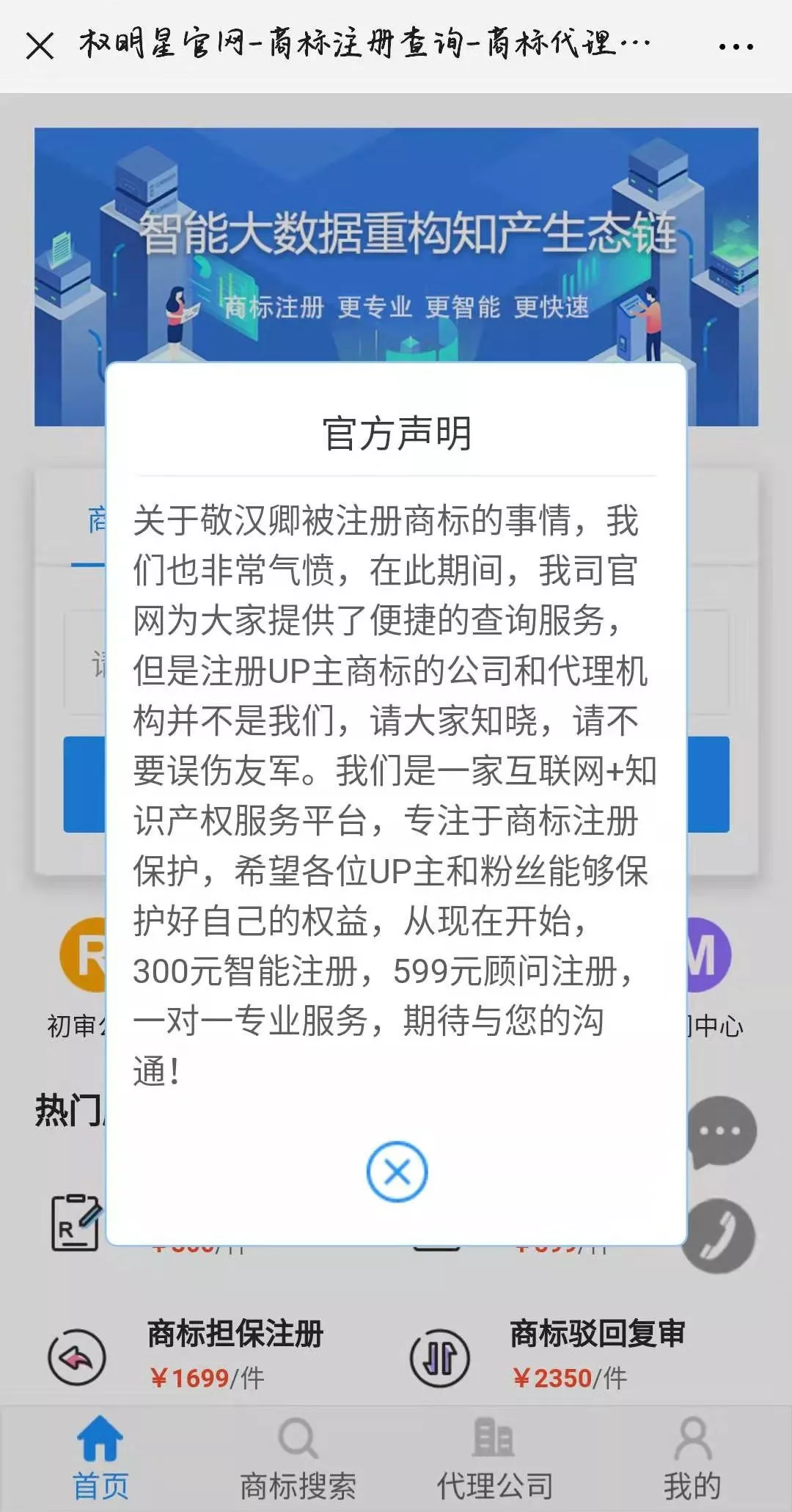 据了解,双方在商标转让合同中约定,商标受让人汉卿传媒在收到全部商标转让文件后,应就敬汉卿于8月2日在哔哩哔哩网(bilibili,即上文所称B站)发布有关“敬汉卿商标”的帖子进行删除。并在B站发布声明称,告知双方已和解。