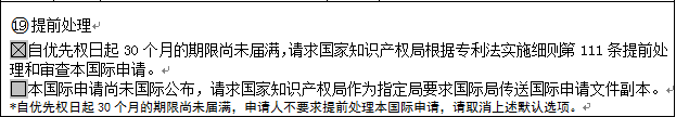 国际申请尚未国际公布时,请求提前处理并且请求国家知识产权局向国际局索要申请文件副本的,如下图所示需选中19栏中所有选项。