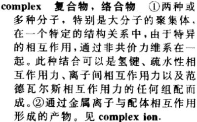 在146专利无效案中,专利权人提供的反证1为《英汉生物化学及分子生物学词典》(谭景莹等主编,科学出版社,2000年07月),其被采信的“复合物”定义如下: